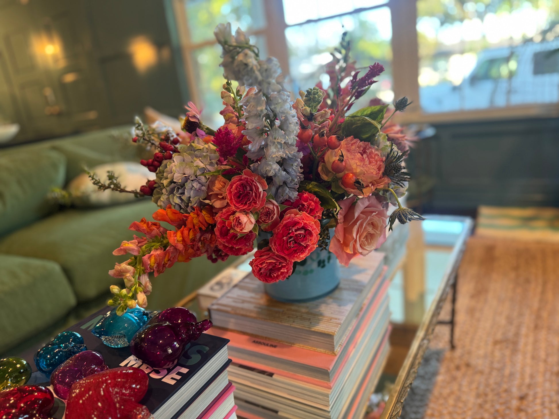Gift a stunning floral design for any occasion. Designer's choice is available in 3 sizes (medium pictured). Always made with fresh seasonal flowers in vibrant hues. If you're looking for something more specific, contact us to design a custom arrangement!