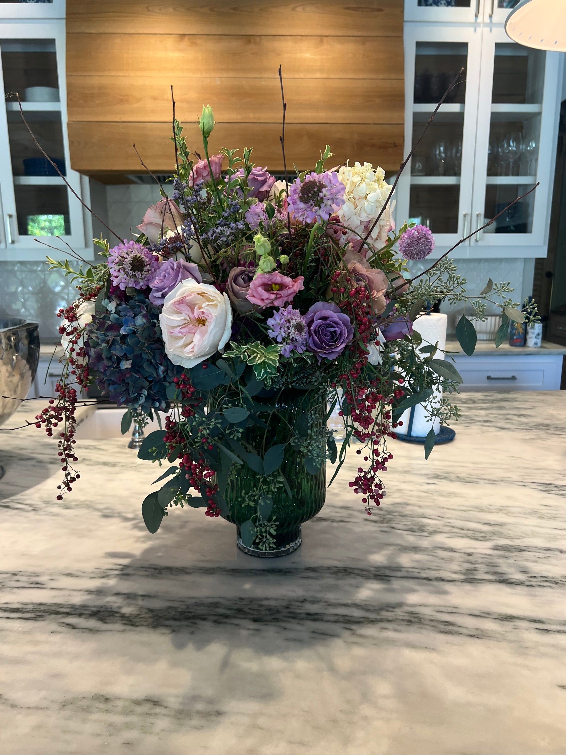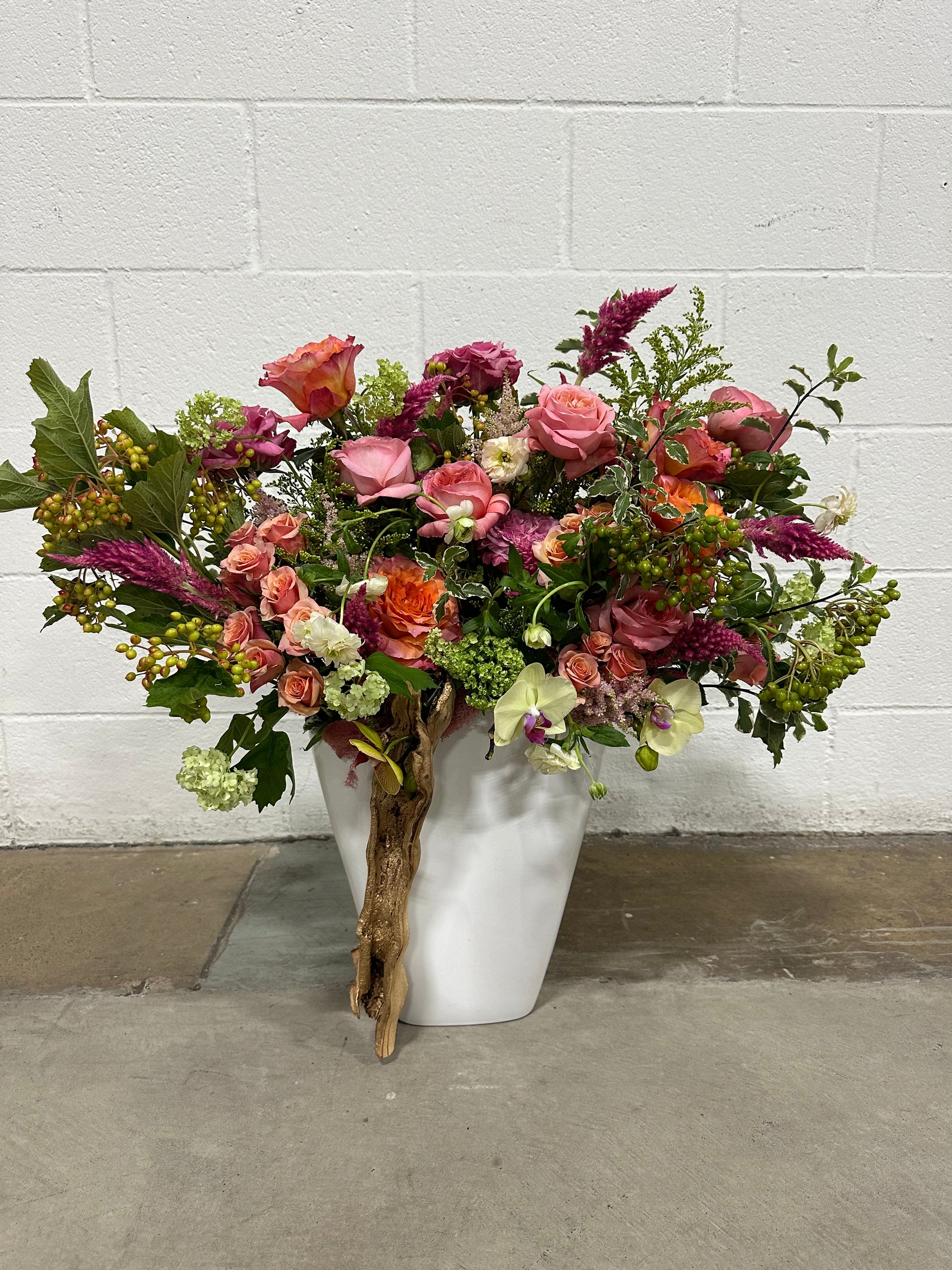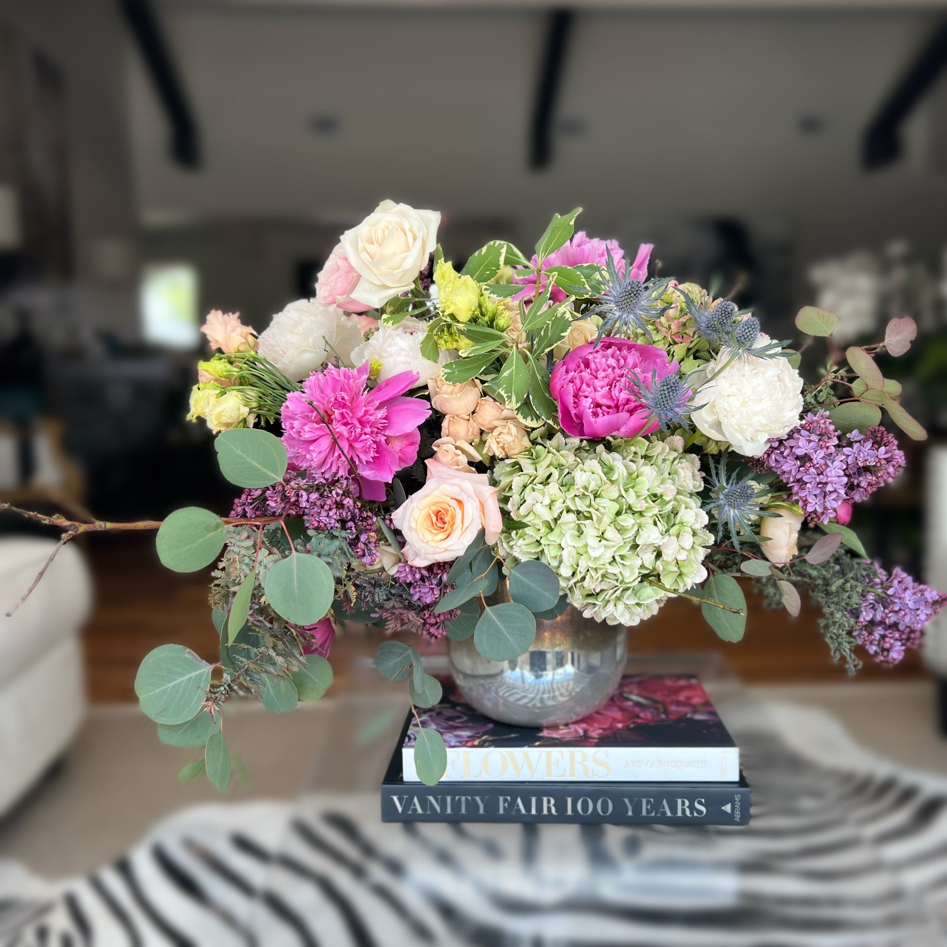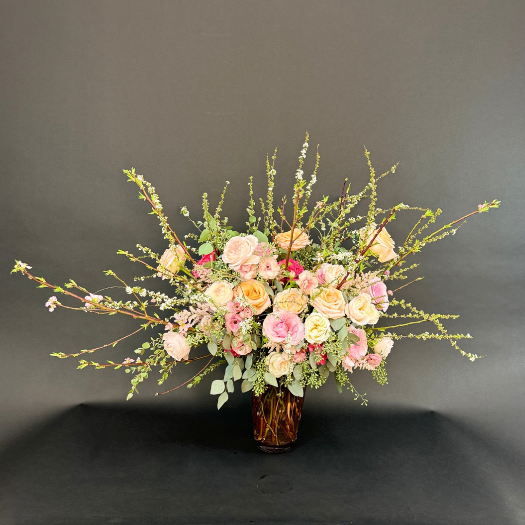 Gift a stunning floral design for any occasion. Designer's choice is available in 3 sizes (large pictured). Always made with fresh seasonal flowers in vibrant hues. If you're looking for something more specific, contact us to design a custom arrangement!
